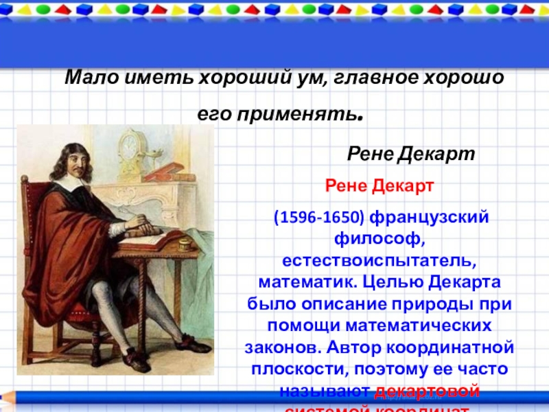 (1596-1650) французский философ, естествоиспытатель, математик. Целью Декарта было описание природы при помощи математических законов. Автор координатной плоскости, поэтому ее часто называют декартовой системой координат.