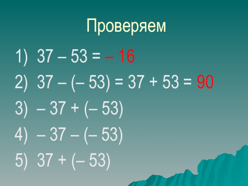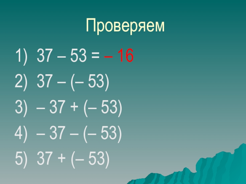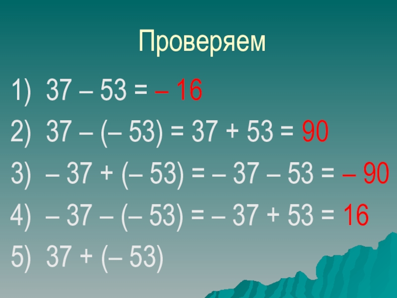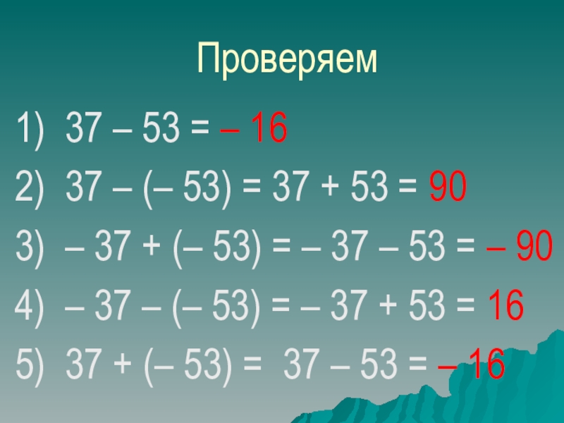 4) – 37 – (– 53) = – 37 + 53 = 16