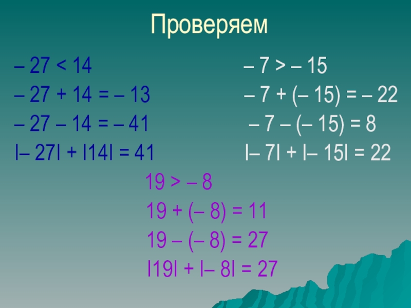 – 27 + 14 = – 13 – 7 + (– 15) = – 22