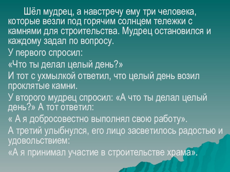 везли под горячим солнцем тележки с камнями для строительства. Мудрец остановился и каждому задал по вопросу.