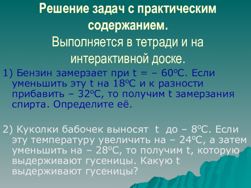 2) Куколки бабочек выносят t до – 8оС. Если эту температуру увеличить на – 24оС, а затем уменьшить на – 28оС, то получим t, которую выдерживают гусеницы. Какую t выдерживают гусеницы?