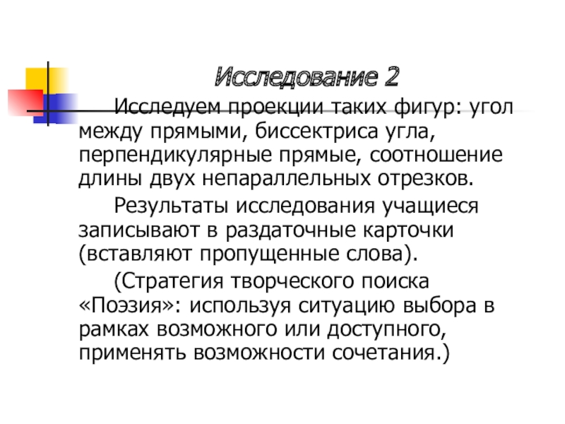 Исследуем проекции таких фигур: угол между прямыми, биссектриса угла, перпендикулярные