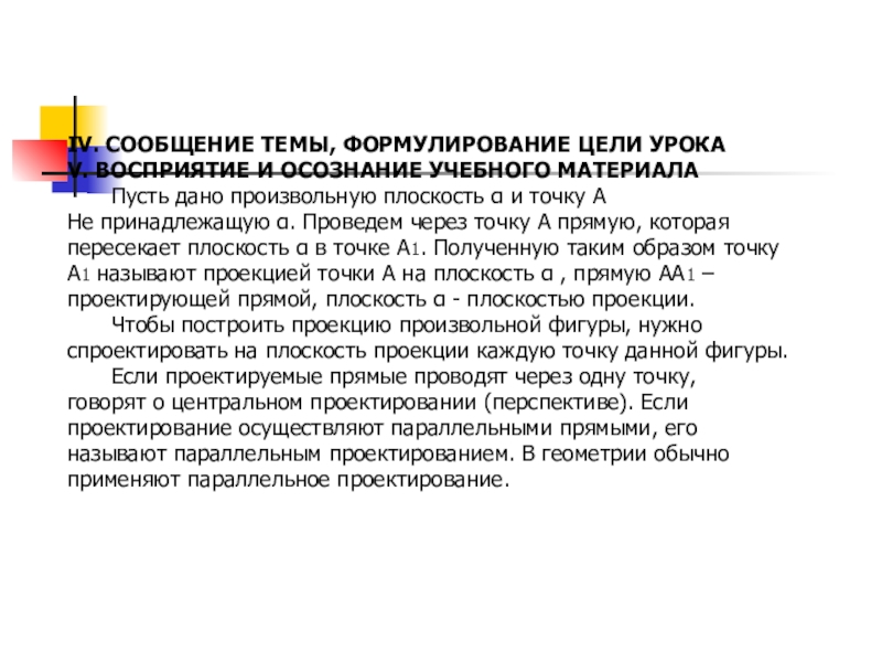 Цель: сформулировать понятие параллельного проектирования; добиться усвоения свойств параллельного проектирования; формировать у учащихся умение применять понятия и свойства параллельного проектирования к решению задач; развивать абстрактное мышление, пространственное воображение и интуицию, познавательный интерес.
