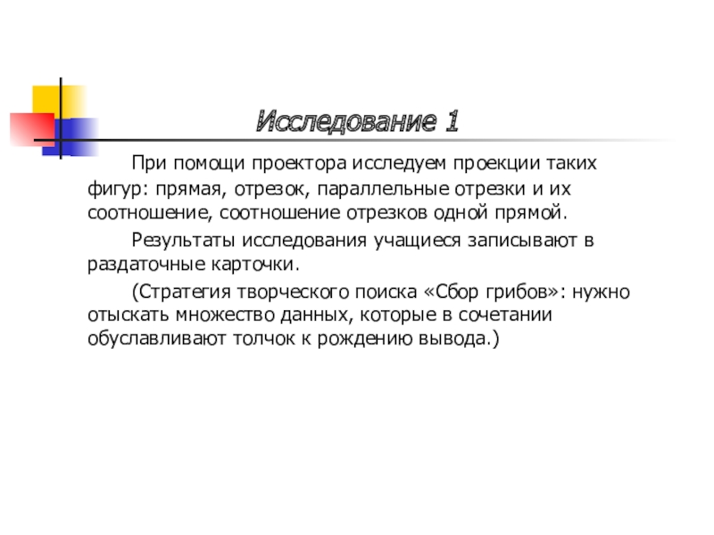 (Стратегия творческого поиска «Сбор грибов»: нужно отыскать множество данных, которые в сочетании обуславливают толчок к рождению вывода.)
