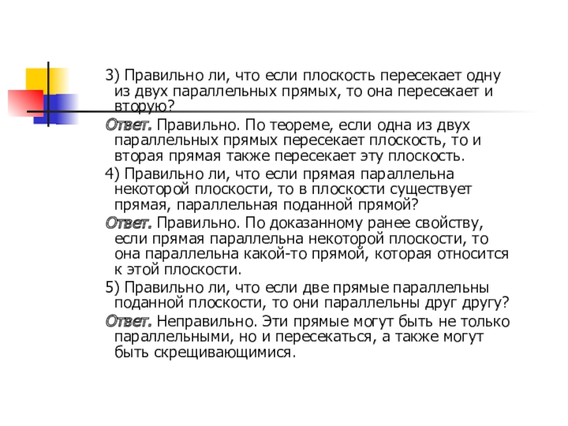 Слайд 4 3) Правильно ли, что если плоскость пересекает одну из двух параллельных