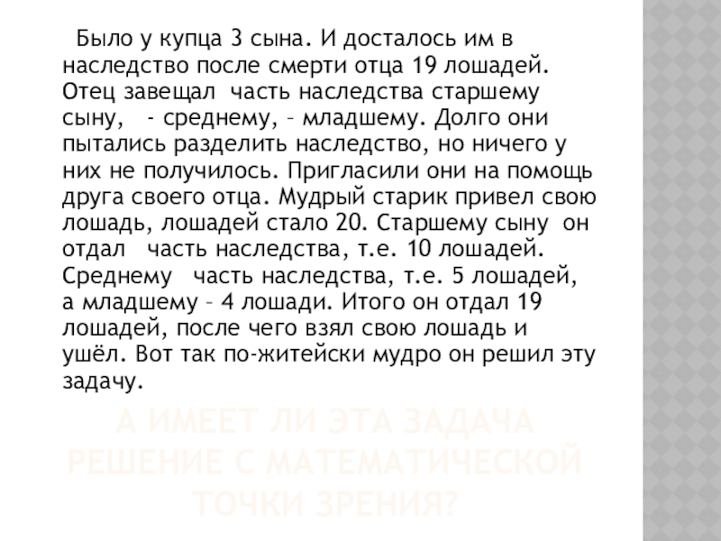 купца 3 сына. И досталось им в наследство после смерти отца 19 лошадей. Отец завещал часть наследства старшему сыну, - среднему, – младшему. Долго они пытались разделить наследство, но ничего у них не получилось. Пригласили они на помощь друга своего отца. Мудрый старик привел свою лошадь, лошадей стало 20. Старшему сыну он отдал часть наследства, т.е. 10 лошадей. Среднему часть наследства, т.е. 5 лошадей, а младшему – 4 лошади. Итого он отдал 19 лошадей, после чего взял свою лошадь и ушёл. Вот так по-житейски мудро он решил эту задачу.