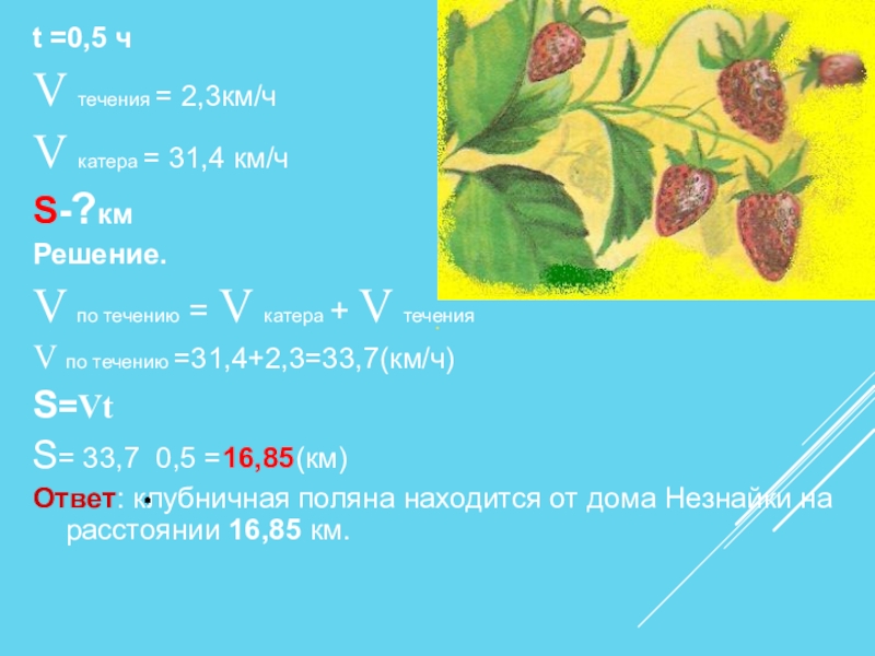 До земляничной поляны Незнайка плыл 0,5 часа на пароходике по течению