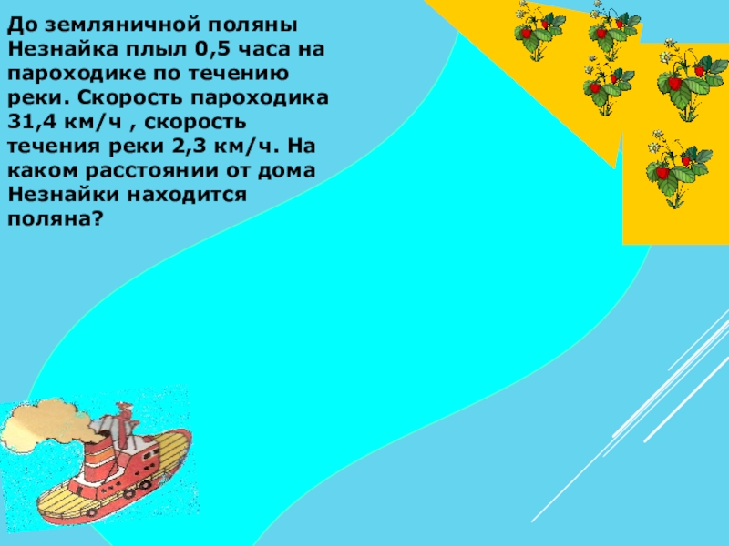 реки. Скорость пароходика 31,4 км/ч , скорость течения реки 2,3 км/ч. На каком расстоянии от дома Незнайки находится поляна?