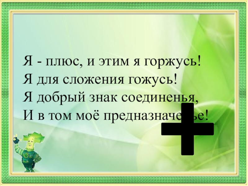 Я - плюс, и этим я горжусь! Я для сложения гожусь!Я добрый знак соединенья,И в том моё
