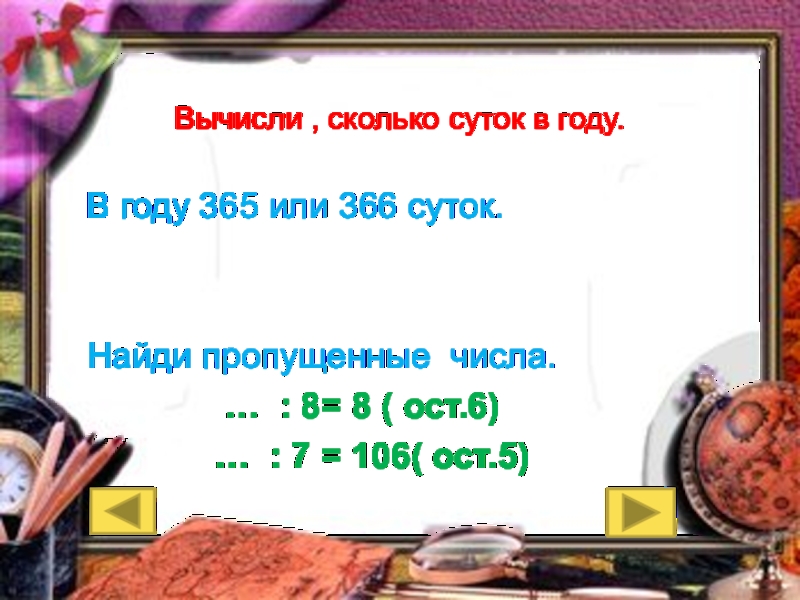 Вычисли , сколько суток в году.В году 365 или 366 суток.Найди пропущенные числа. … : 8= 8 ( ост.6) … : 7 = 106(