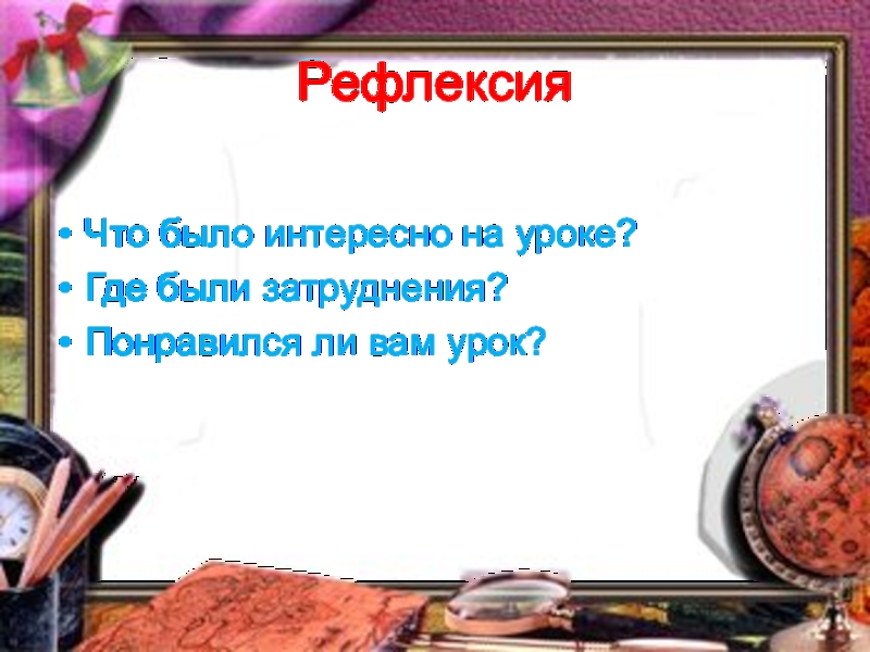 РефлексияЧто было интересно на уроке?Где были затруднения?Понравился ли вам урок?