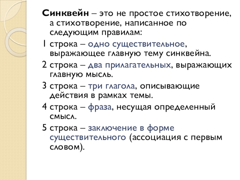 Синквейн – это не простое стихотворение, а стихотворение, написанное по следующим правилам:1 строка – одно существительное, выражающее главную