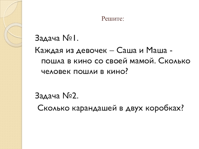 Решите:Задача №1.Каждая из девочек – Саша и Маша - пошла в кино со своей мамой. Сколько человек пошли в кино?Задача №2. Сколько карандашей в двух коробках?