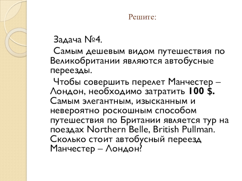 Решите:  Задача №4.  Самым дешевым видом путешествия по Великобритании являются автобусные переезды.
