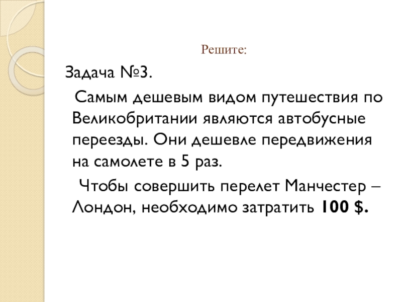 Решите: Задача №3.  Самым дешевым видом путешествия по Великобритании являются автобусные переезды. Они дешевле передвижения