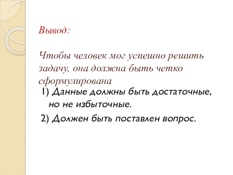 Слайд 5 Вывод: Чтобы человек мог успешно решить задачу, она должна быть четко сформулирована