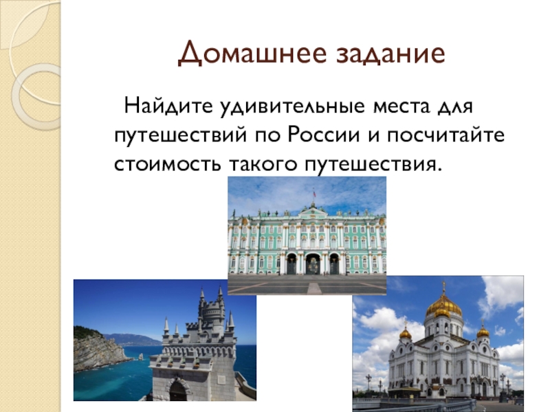 Домашнее задание  Найдите удивительные места для путешествий по России и посчитайте стоимость такого путешествия.