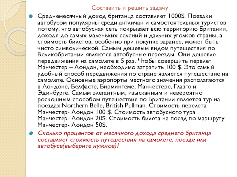 Составить и решить задачуСреднемесячный доход британца составляет 1000$. Поездки автобусом популярны среди англичан и самостоятельных туристов потому,