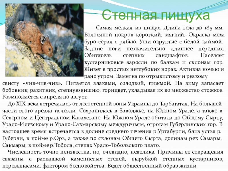 Самая мелкая из пищух. Длина тела до 185 мм. Волосяной покров короткий, мягкий. Окраска меха буро-серая с рябью. Уши округлые с белой каймой. Задние ноги незначительно длиннее передних. Обитатель степных ландшафтов. Населяет кустарниковые заросли по балкам и склонам гор. Живет в простых неглубоких норах. Активна ночью и рано утром. Заметна по отрывистому и резкому