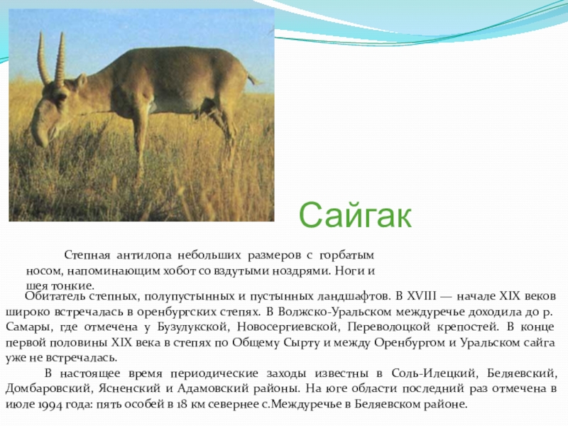 Обитатель степных, полупустынных и пустынных ландшафтов. В XVIII — начале XIX веков широко встречалась в оренбургских степях. В Волжско-Уральском междуречье доходила до р. Самары, где отмечена у Бузулукской, Новосергиевской, Переволоцкой крепостей. В конце первой половины XIX века в степях по Общему Сырту и между Оренбургом и Уральском сайга уже не встречалась.