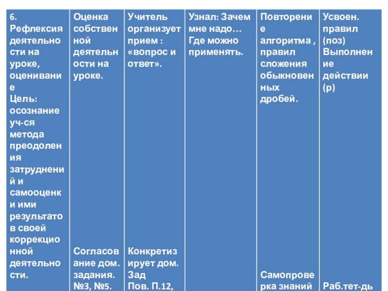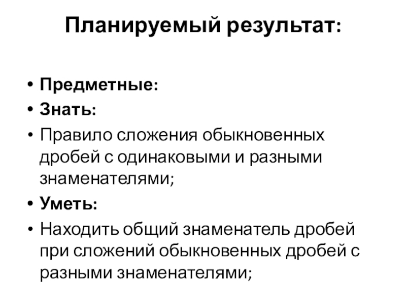 Планируемый результат: Предметные:Знать:Правило сложения обыкновенных дробей с одинаковыми и разными знаменателями;Уметь:Находить общий знаменатель дробей при сложений обыкновенных