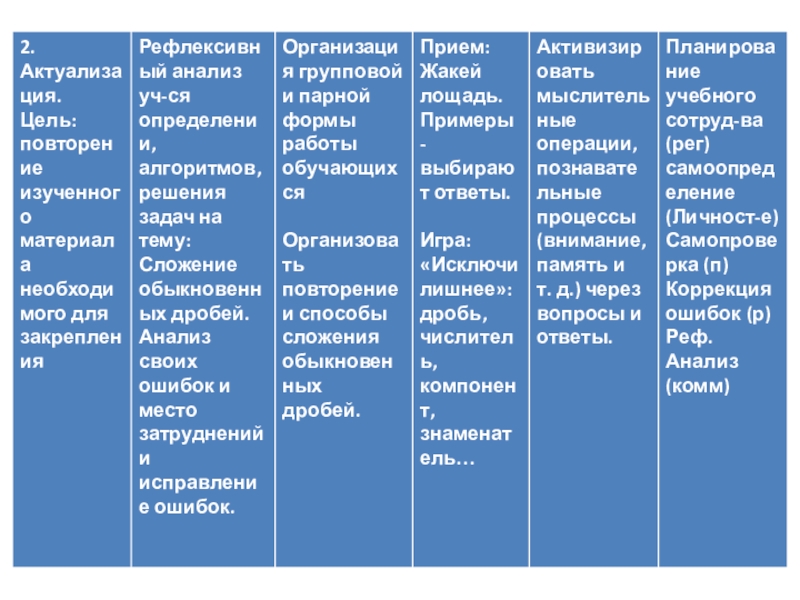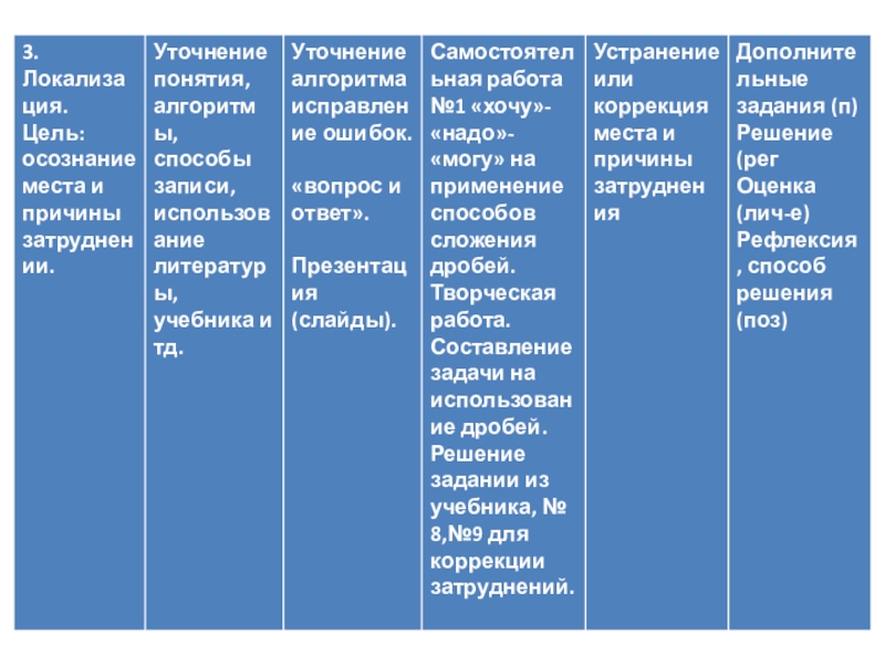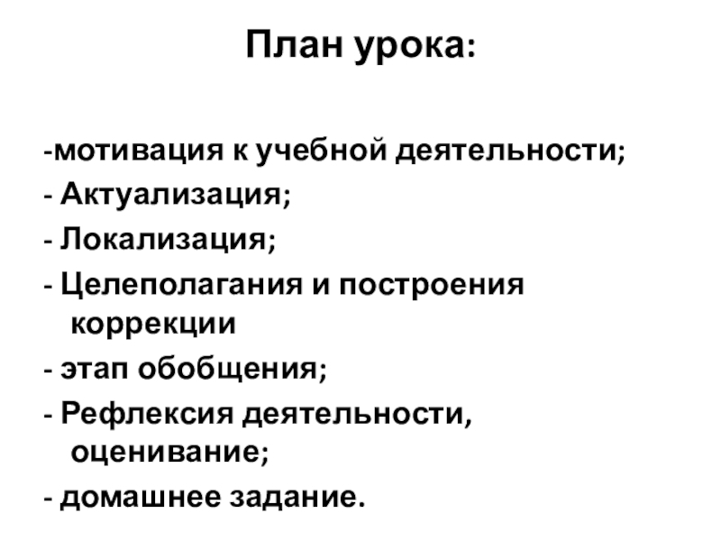 План урока: -мотивация к учебной деятельности;- Актуализация;- Локализация;- Целеполагания и построения коррекции- этап обобщения;- Рефлексия деятельности, оценивание;-