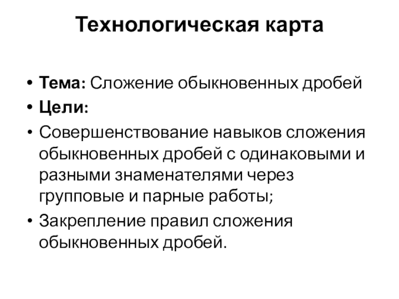 Технологическая карта Тема: Сложение обыкновенных дробейЦели:Совершенствование навыков сложения обыкновенных дробей с одинаковыми и разными знаменателями через групповые и парные работы;Закрепление правил сложения обыкновенных дробей.