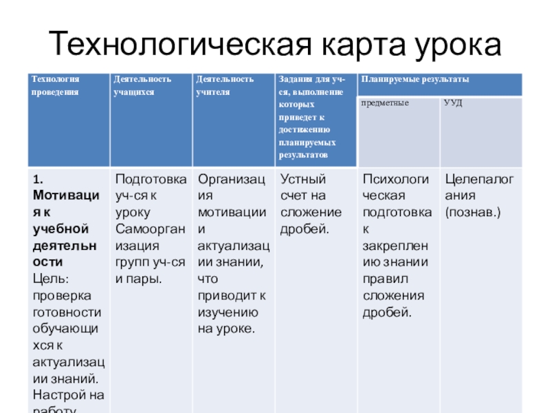 Технологическая карта  Тема: Сложение обыкновенных дробейЦели:Совершенствование навыков сложения обыкновенных дробей с одинаковыми и разными знаменателями через