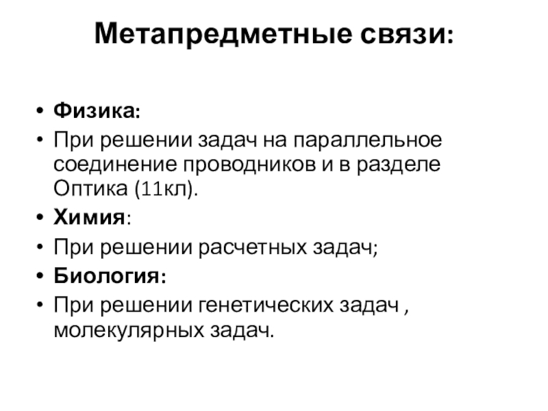 Метапредметные связи: Физика:При решении задач на параллельное соединение проводников и в разделе Оптика (11кл).Химия:При решении расчетных задач;Биология:При