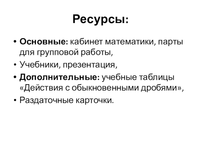Ресурсы:Основные: кабинет математики, парты для групповой работы,Учебники, презентация,Дополнительные: учебные таблицы «Действия с обыкновенными дробями»,Раздаточные карточки.