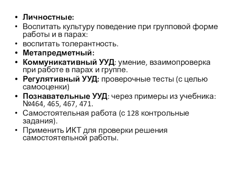 Личностные:Воспитать культуру поведение при групповой форме работы и в парах:воспитать толерантность.Метапредметный:Коммуникативный УУД: умение, взаимопроверка при работе в