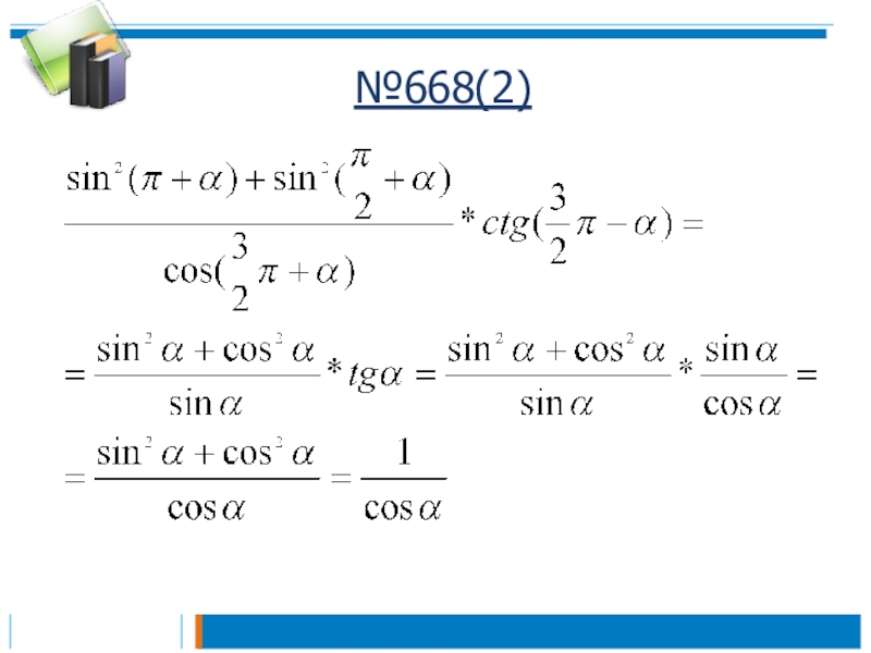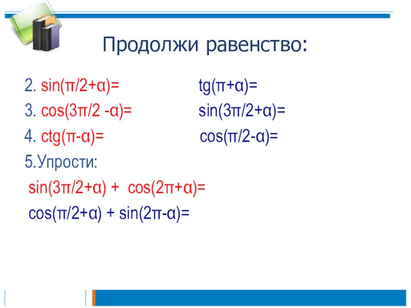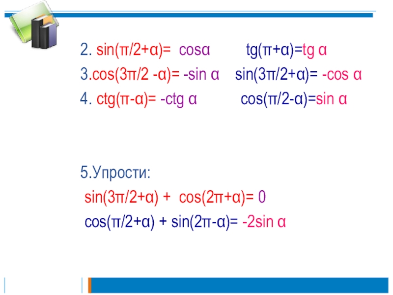 Слайд 282. sin(π/2+α)= cosα tg(π+α)=tg α