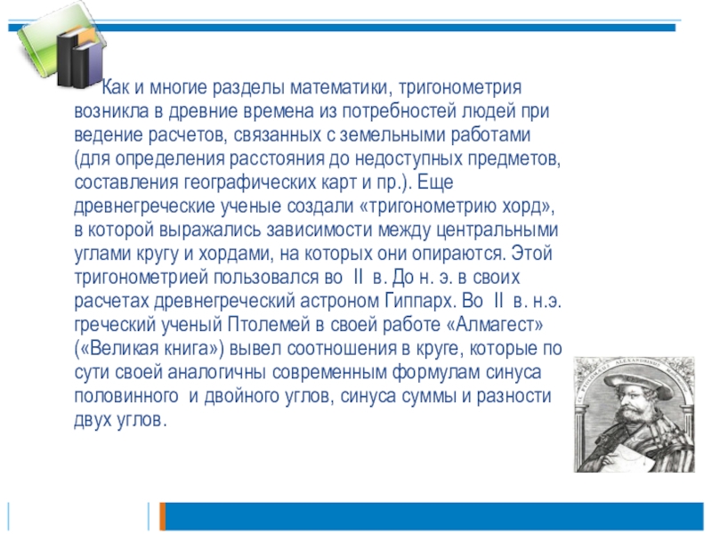 возникла в древние времена из потребностей людей при ведение расчетов, связанных с земельными работами (для определения расстояния до недоступных предметов, составления географических карт и пр.). Еще древнегреческие ученые создали «тригонометрию хорд», в которой выражались зависимости между центральными углами кругу и хордами, на которых они опираются. Этой тригонометрией пользовался во II в. До н. э. в своих расчетах древнегреческий астроном Гиппарх. Во II в. н.э. греческий ученый Птолемей в своей работе «Алмагест» («Великая книга») вывел соотношения в круге, которые по сути своей аналогичны современным формулам синуса половинного и двойного углов, синуса суммы и разности двух углов.