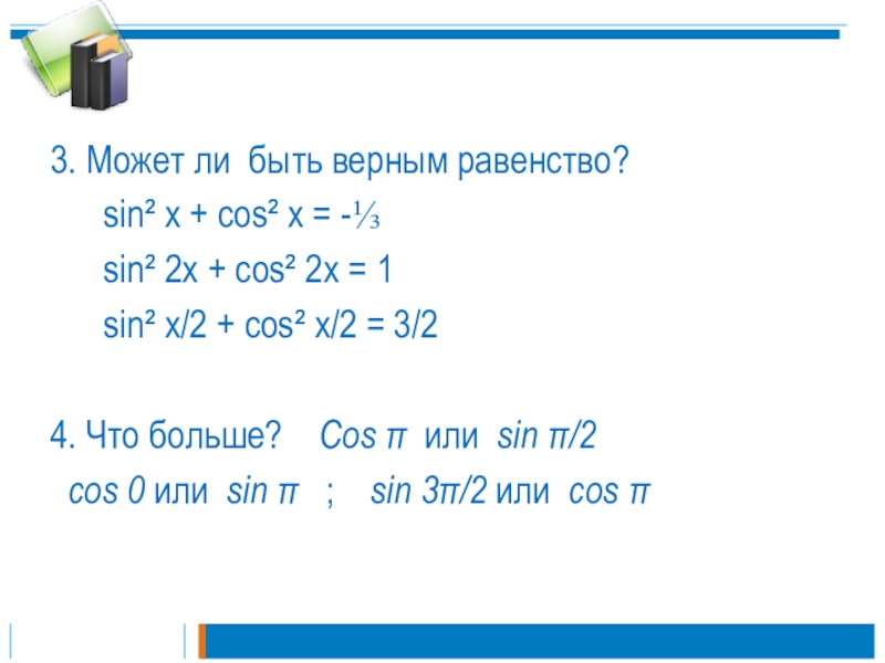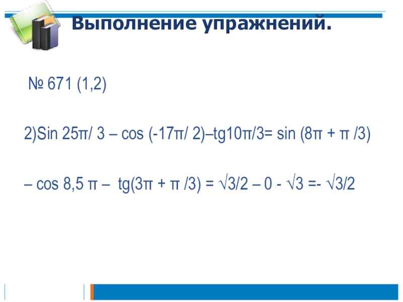 – cos 8,5 π – tg(3π + π /3) = √3/2 – 0 - √3 =- √3/2