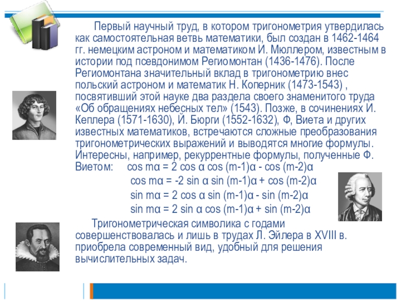 тригонометрия утвердилась как самостоятельная ветвь математики, был создан в 1462-1464 гг. немецким астроном и математиком И. Мюллером, известным в истории под псевдонимом Региомонтан (1436-1476). После Региомонтана значительный вклад в тригонометрию внес польский астроном и математик Н. Коперник (1473-1543) , посвятивший этой науке два раздела своего знаменитого труда «Об обращениях небесных тел» (1543). Позже, в сочинениях И. Кеплера (1571-1630), Й. Бюрги (1552-1632), Ф, Виета и других известных математиков, встречаются сложные преобразования тригонометрических выражений и выводятся многие формулы. Интересны, например, рекуррентные формулы, полученные Ф. Виетом: cos mα = 2 cos α cos (m-1)α - cos (m-2)α