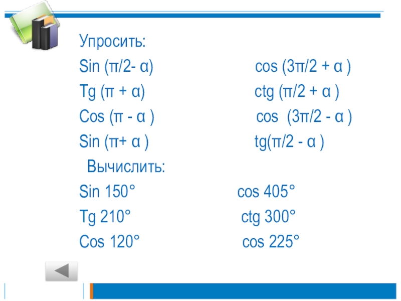 4. ctg(π-α)= -ctg α cos(π/2-α)=sin α