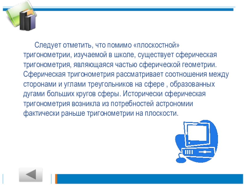 тригонометрии, изучаемой в школе, существует сферическая тригонометрия, являющаяся частью сферической геометрии. Сферическая тригонометрия рассматривает соотношения между сторонами и углами треугольников на сфере , образованных дугами больших кругов сферы. Исторически сферическая тригонометрия возникла из потребностей астрономии фактически раньше тригонометрии на плоскости.