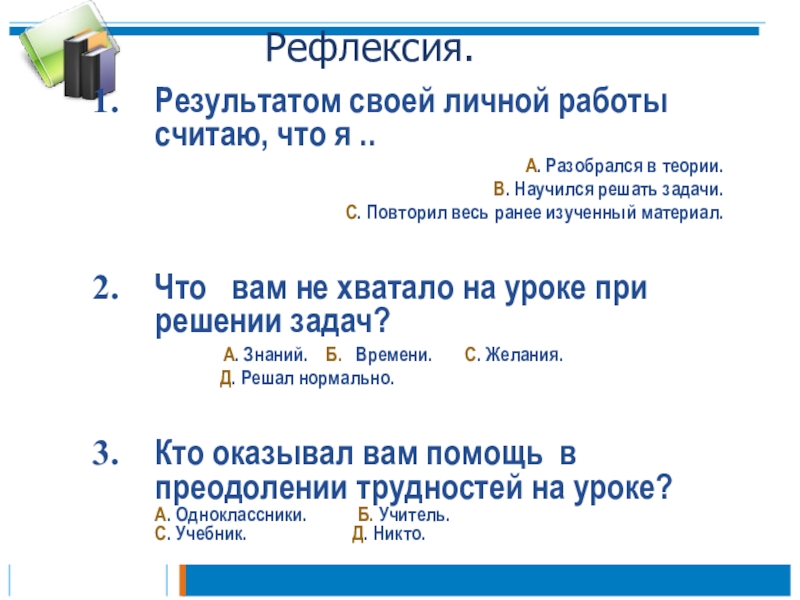 Кто оказывал вам помощь в преодолении трудностей на уроке? А. Одноклассники. Б. Учитель. С. Учебник. Д. Никто.