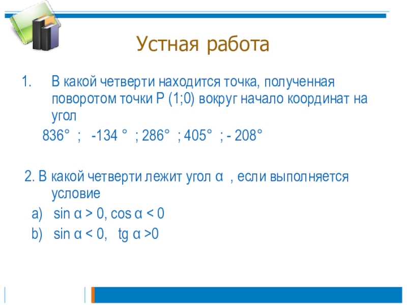 В какой четверти находится точка, полученная поворотом точки Р (1;0)