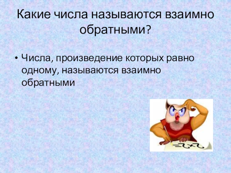 Какие числа называются взаимно обратными?Числа, произведение которых равно одному, называются взаимно обратными