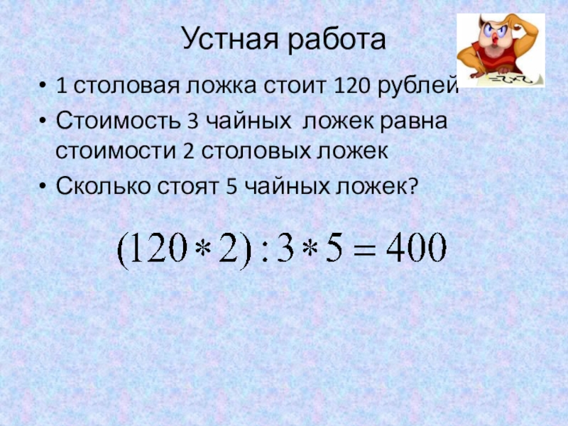 Устная работа1 столовая ложка стоит 120 рублейСтоимость 3 чайных ложек равна стоимости 2 столовых ложекСколько стоят 5