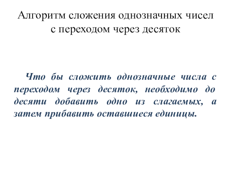 Алгоритм сложения однозначных чисел с переходом через десятокЧто бы сложить однозначные числа с переходом через десяток, необходимо
