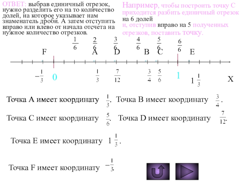 Например, чтобы построить точку С приходится разбить единичный отрезок на 6 долей