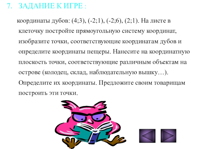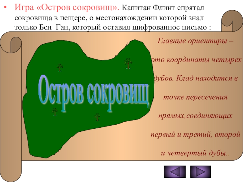 Главные ориентиры – это координаты четырех дубов. Клад находится в точке пересечения прямых,соединяющих первый и третий, второй и четвертый дубы..