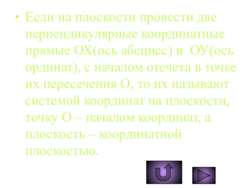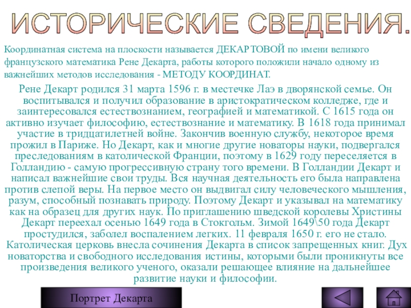 Координатная система на плоскости называется ДЕКАРТОВОЙ по имени великого французского математика Рене Декарта, работы которого положили начало одному из важнейших методов исследования - МЕТОДУ КООРДИНАТ.