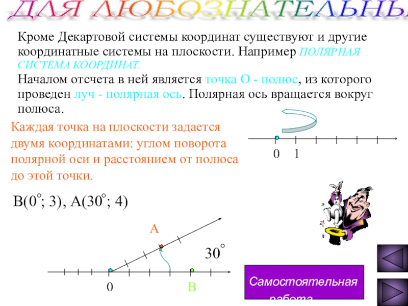 Каждая точка на плоскости задается двумя координатами: углом поворота полярной оси и расстоянием от полюса до этой точки.