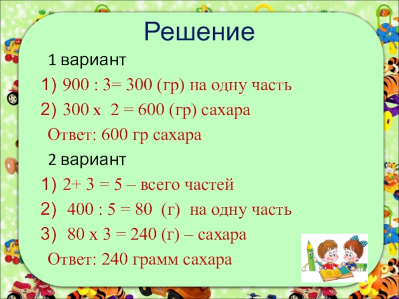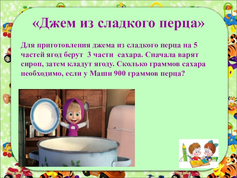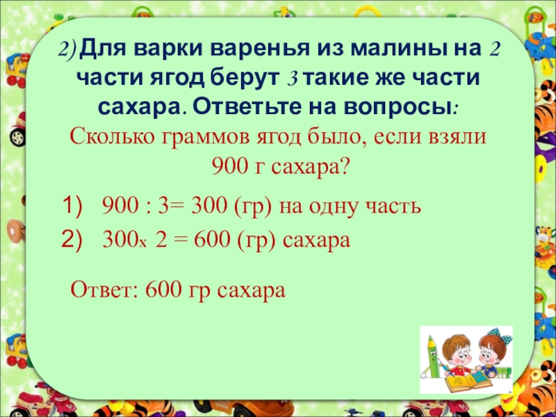 частей ягод берут 3 части сахара. Сначала варят сироп, затем кладут ягоду. Сколько граммов сахара необходимо, если у Маши 900 граммов перца?
