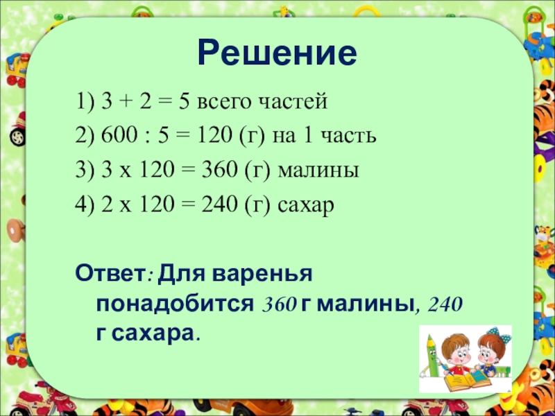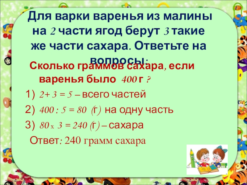 Ответ: Для варенья понадобится 360 г малины, 240 г сахара.