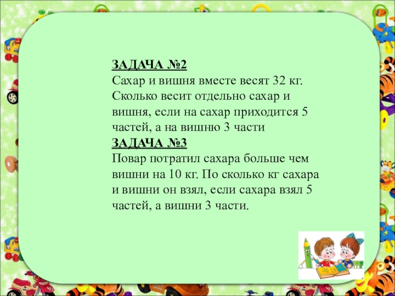 Сахар и вишня вместе весят 32 кг. Сколько весит отдельно