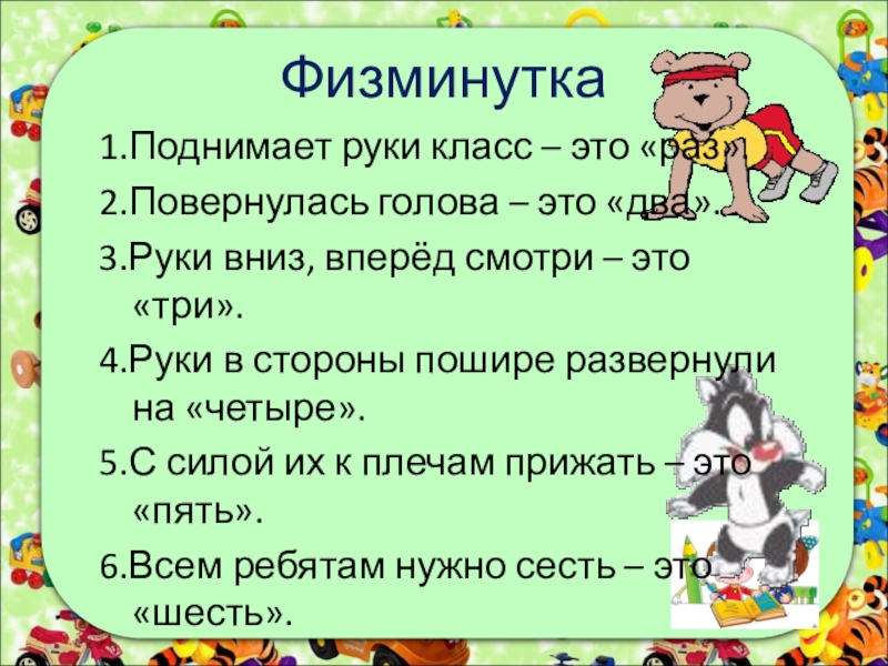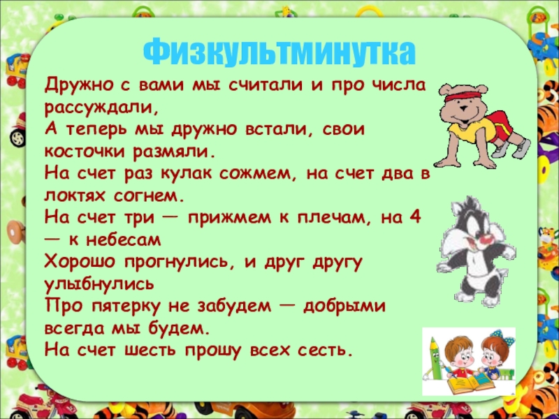 На счет раз кулак сожмем, на счет два в локтях согнем.